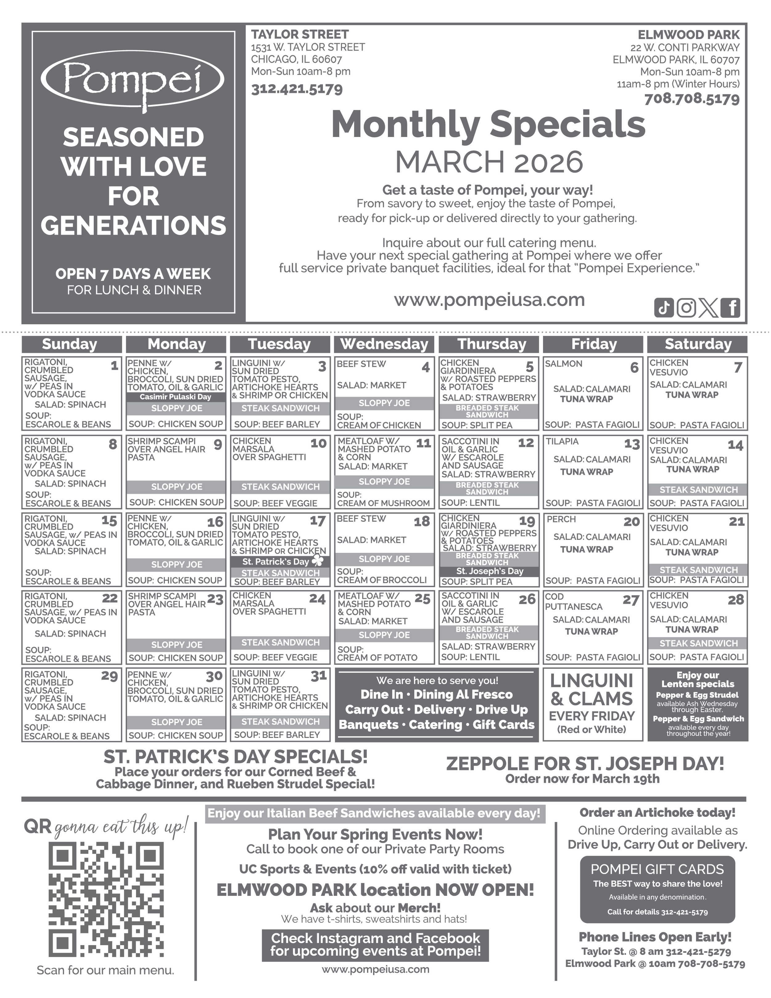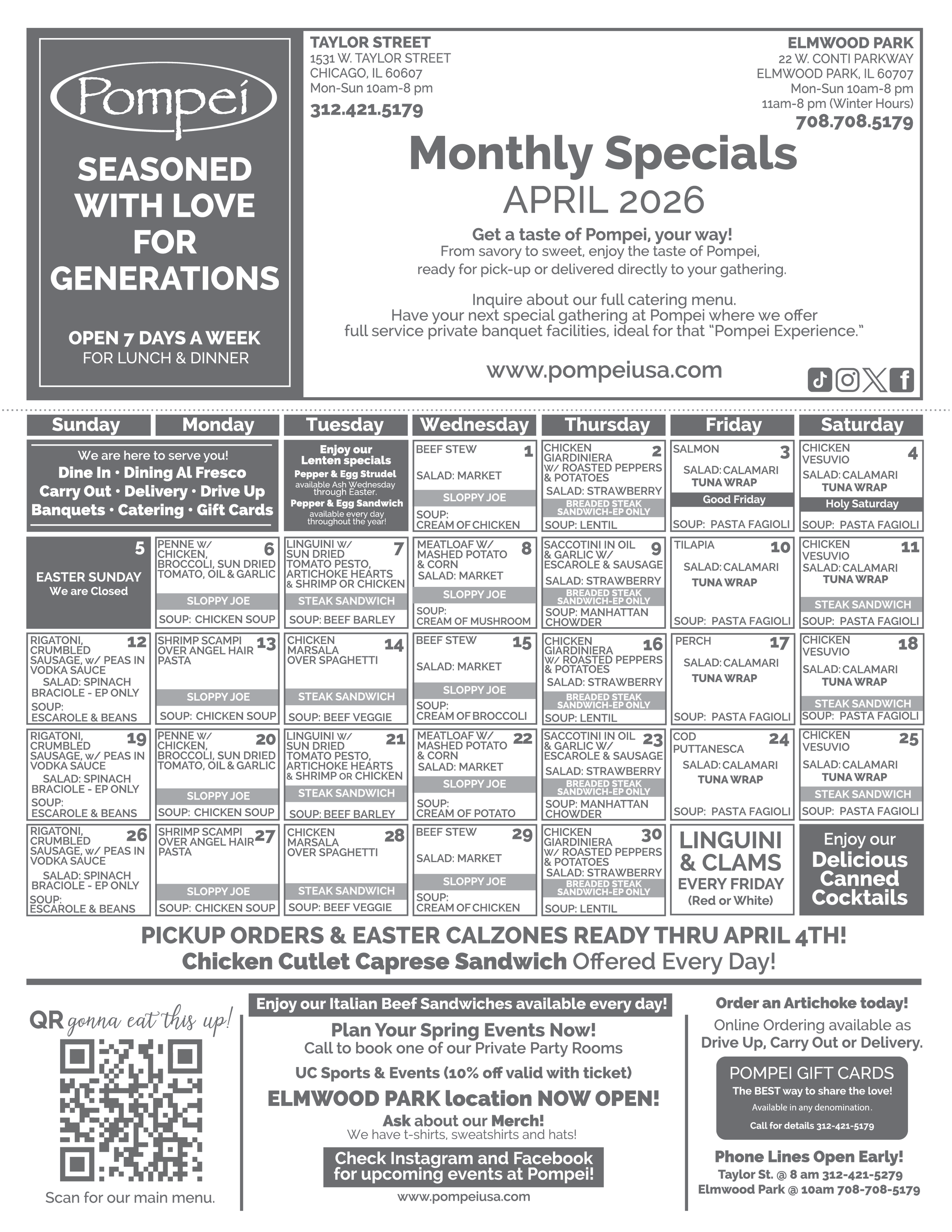 Hot, delicious paninis, chili, meat loaf, ribs and seasonal salads are just a few of the many items Pompei has available on its menu to please our valued customers. Interested in doing some of your own cooking? Take some of Pompei specialty items home like our delicious salad dressings, sauces or par-cooked items like pizzas, strudels or lasagna, and make a meal for your family just like we have for 5 generations.